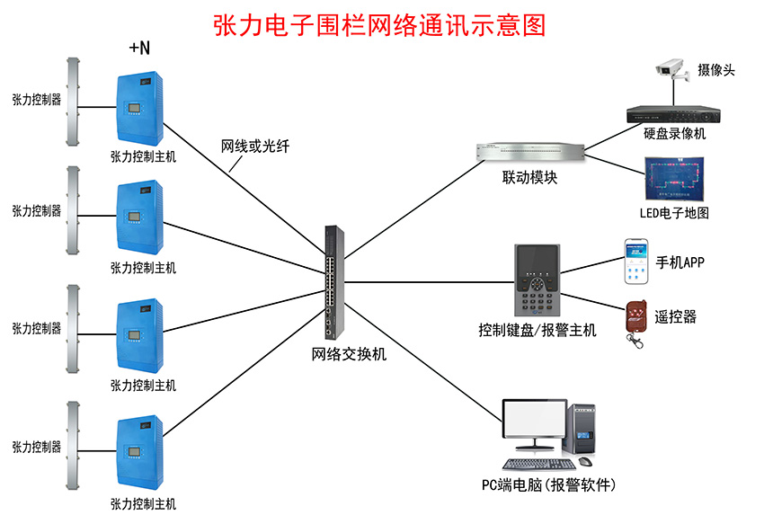 張力電子圍欄報警系統示意圖——網絡通訊+LED電子屏+語音